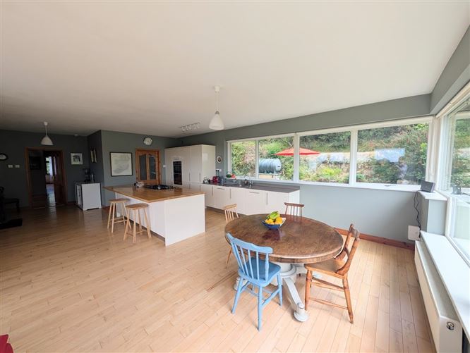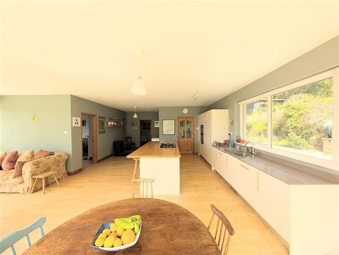 L shaped, Panoramic views, solid maple floor, high gloss Cream fitted kitchen units, Integrated Siemens 5 ring gas hob on island unit, Double oven, integrated fridge/freezer, integrated dishwasher, solid fuel stove with back boiler.