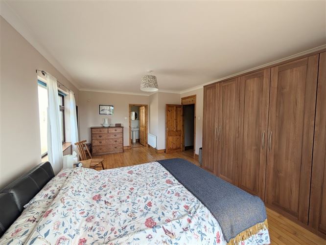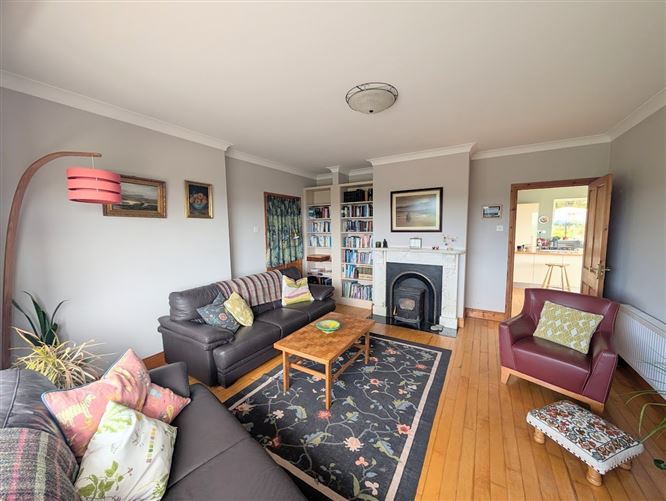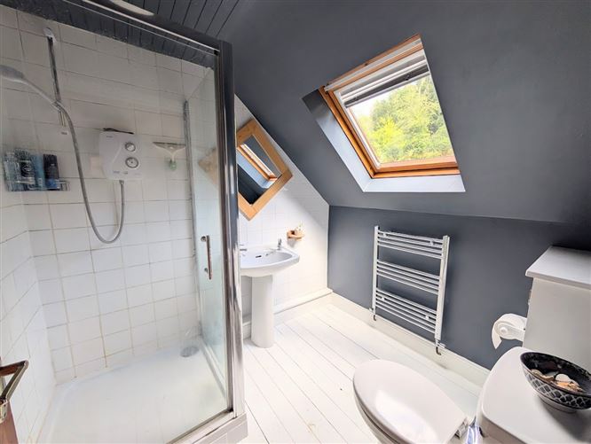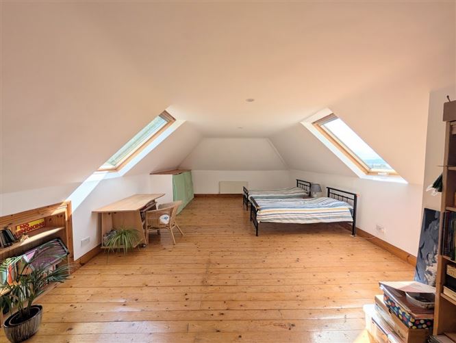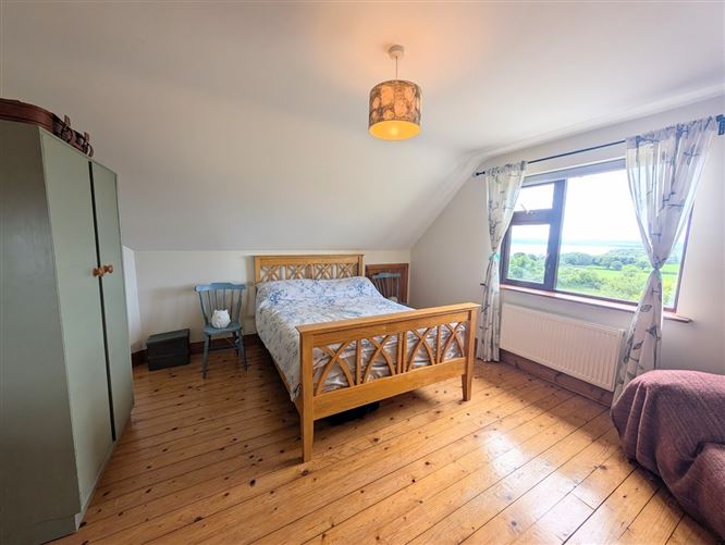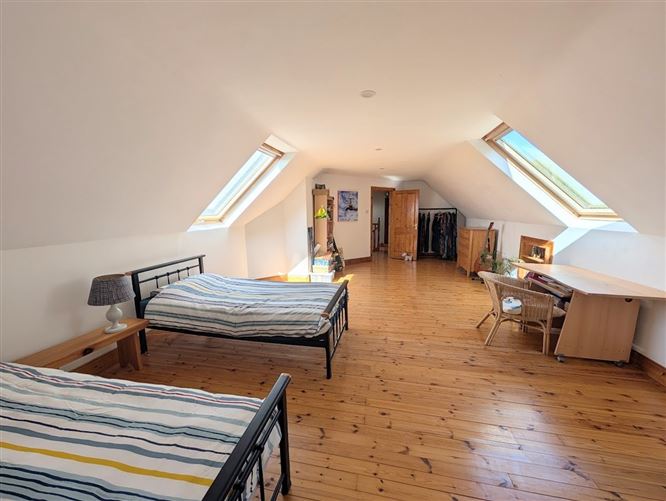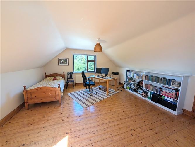 Adjacent to the kitchen is a cosy sitting room with bay window, also with spectacular lake views. The solid fuel stove and integrated bookshelves create a warm and inviting atmosphere. The ground floor also includes a well-equipped utility room, a large main bathroom, and three generously sized double bedrooms, the master of which boasts an en-suite bathroom.