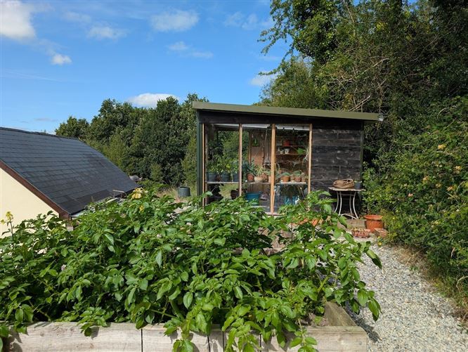 decking for watching the sunsets or stargazing, and a greenhouse/potting shed with raised beds to the rear. The mature gardens have been well maintained by the current owners and planted with many native trees and plants.
